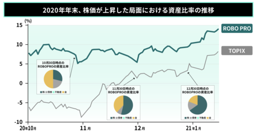 - 市場環境をAIが分析し、資産配分を柔軟に変更する